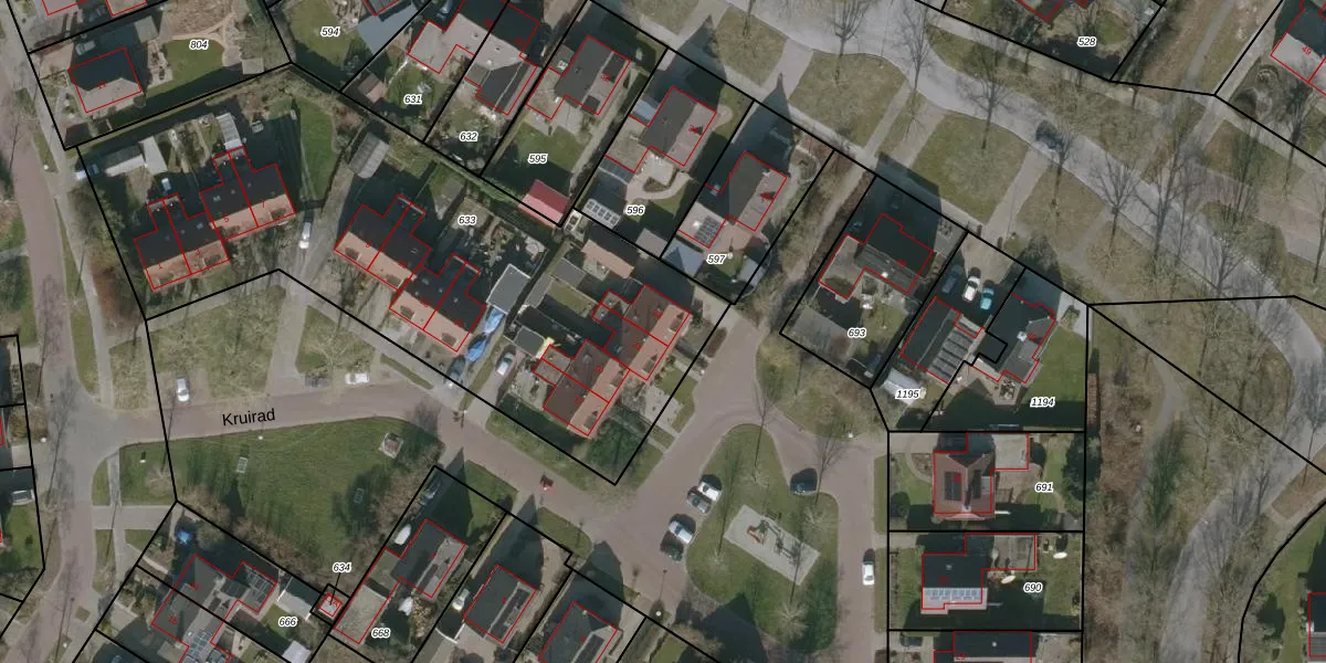 Het perceel waarop Kruirad 23 staat heeft een oppervlakte van 2813 m². Dit is een zeer groot perceel. De perceeloppervlakte wordt geregistreerd door het Kadaster. Gedetailleerde informatie over de maten van dit perceel kunt u vinden in het rapport Kadastrale kaart met maatvoering van Kruirad 23.