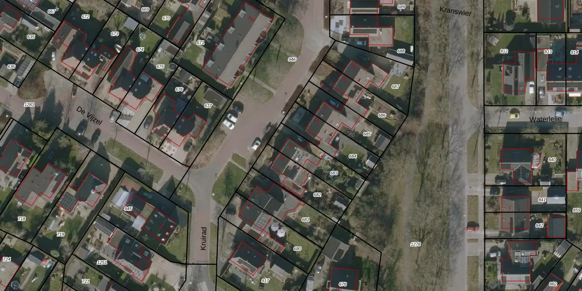 Het perceel waarop Kruirad 41 staat heeft een oppervlakte van 303 m². Dit is een groot perceel. De perceeloppervlakte wordt geregistreerd door het Kadaster. Gedetailleerde informatie over de maten van dit perceel kunt u vinden in het rapport Kadastrale kaart met maatvoering van Kruirad 41.