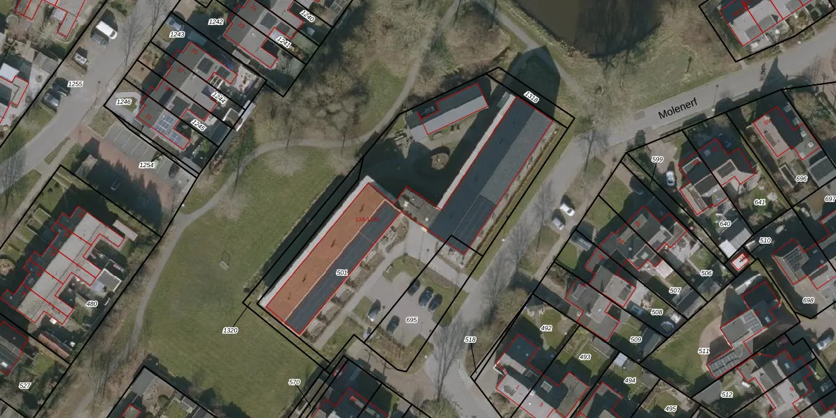 Het perceel waarop Molenerf 114 staat heeft een oppervlakte van 2223 m². Dit is een zeer groot perceel. De perceeloppervlakte wordt geregistreerd door het Kadaster. Gedetailleerde informatie over de maten van dit perceel kunt u vinden in het rapport Kadastrale kaart met maatvoering van Molenerf 114.