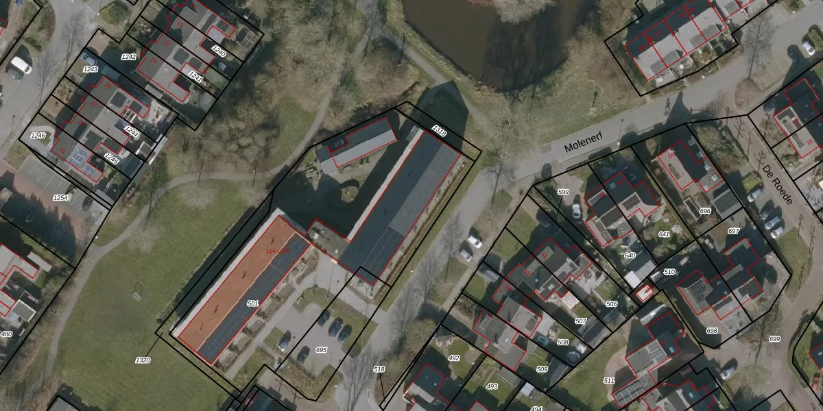 Het perceel waarop Molenerf 114-O staat heeft een oppervlakte van 2223 m². Dit is een zeer groot perceel. De perceeloppervlakte wordt geregistreerd door het Kadaster. Gedetailleerde informatie over de maten van dit perceel kunt u vinden in het rapport Kadastrale kaart met maatvoering van Molenerf 114-O.