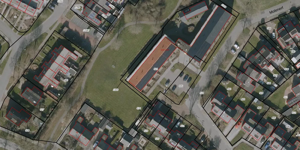Het perceel waarop Molenerf 114-V staat heeft een oppervlakte van 2223 m². Dit is een zeer groot perceel. De perceeloppervlakte wordt geregistreerd door het Kadaster. Gedetailleerde informatie over de maten van dit perceel kunt u vinden in het rapport Kadastrale kaart met maatvoering van Molenerf 114-V.