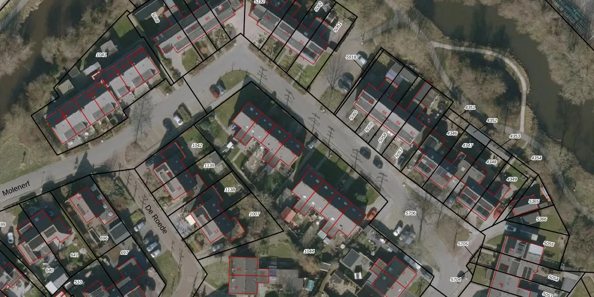 Het perceel waarop Molenerf 41 staat heeft een oppervlakte van 5741 m². Dit is een zeer groot perceel. De perceeloppervlakte wordt geregistreerd door het Kadaster. Gedetailleerde informatie over de maten van dit perceel kunt u vinden in het rapport Kadastrale kaart met maatvoering van Molenerf 41.