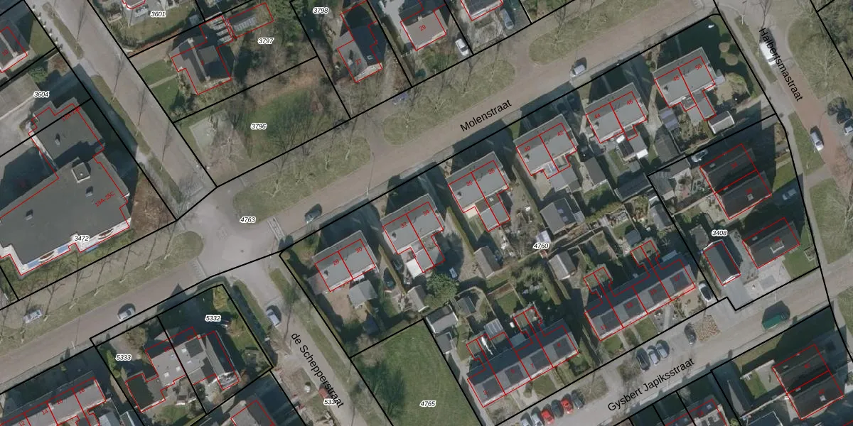 Het perceel waarop Molenstraat 34 staat heeft een oppervlakte van 5283 m². Dit is een zeer groot perceel. De perceeloppervlakte wordt geregistreerd door het Kadaster. Gedetailleerde informatie over de maten van dit perceel kunt u vinden in het rapport Kadastrale kaart met maatvoering van Molenstraat 34.