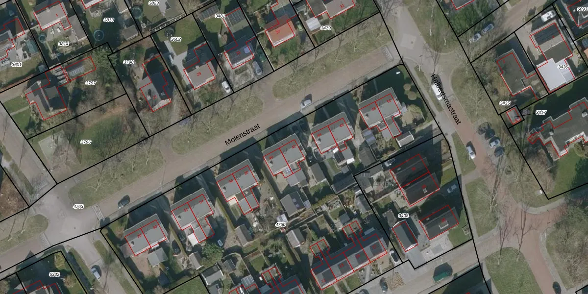 Het perceel waarop Molenstraat 42 staat heeft een oppervlakte van 5283 m². Dit is een zeer groot perceel. De perceeloppervlakte wordt geregistreerd door het Kadaster. Gedetailleerde informatie over de maten van dit perceel kunt u vinden in het rapport Kadastrale kaart met maatvoering van Molenstraat 42.