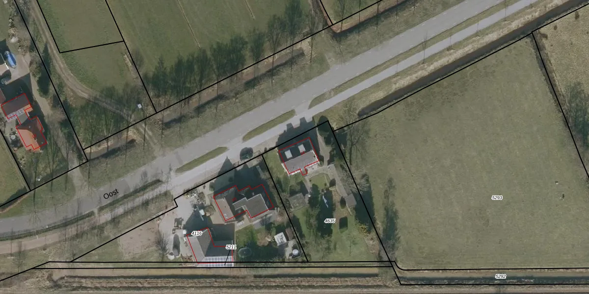 Het perceel waarop Oost 14 staat heeft een oppervlakte van 1190 m². Dit is een zeer groot perceel. De perceeloppervlakte wordt geregistreerd door het Kadaster. Gedetailleerde informatie over de maten van dit perceel kunt u vinden in het rapport Kadastrale kaart met maatvoering van Oost 14.