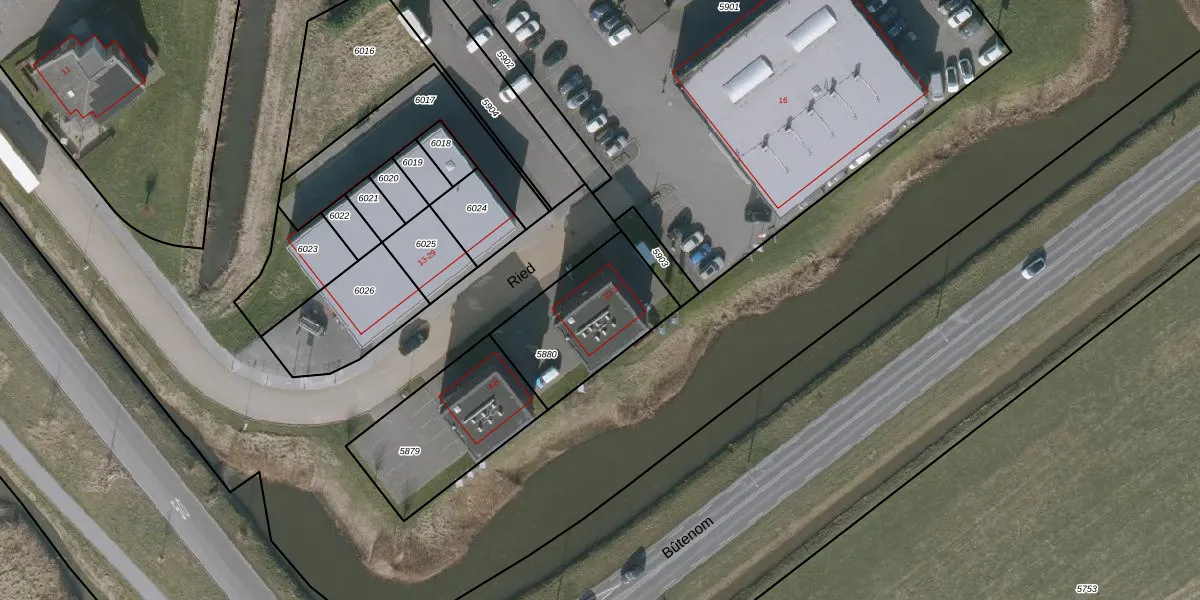 Het perceel waarop Ried 12 staat heeft een oppervlakte van 448 m². Dit is een groot perceel. De perceeloppervlakte wordt geregistreerd door het Kadaster. Gedetailleerde informatie over de maten van dit perceel kunt u vinden in het rapport Kadastrale kaart met maatvoering van Ried 12.