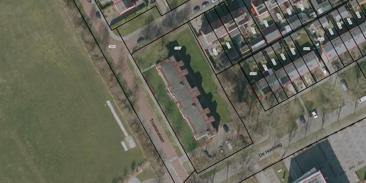 Het perceel waarop Troelstralaan 65 staat heeft een oppervlakte van 2628 m². Dit is een zeer groot perceel. De perceeloppervlakte wordt geregistreerd door het Kadaster. Gedetailleerde informatie over de maten van dit perceel kunt u vinden in het rapport Kadastrale kaart met maatvoering van Troelstralaan 65.