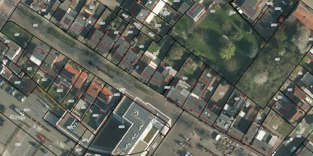Sint Agnesstraat 16 is gelegen op kadastraal perceel BDE00C2223. Deze kadastrale aanduiding is uniek en wordt gebruikt door het Kadaster om eigendomsrechten en andere zakelijke rechten vast te leggen. Het perceel maakt onderdeel uit van de kadastrale gemeente Bunde.