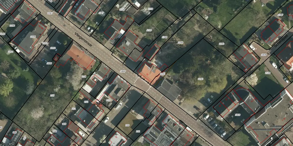 Het perceel waarop Vliegenstraat 61 staat heeft een oppervlakte van 838 m². Dit is een groot perceel. De perceeloppervlakte wordt geregistreerd door het Kadaster. Gedetailleerde informatie over de maten van dit perceel kunt u vinden in het rapport Kadastrale kaart met maatvoering van Vliegenstraat 61.