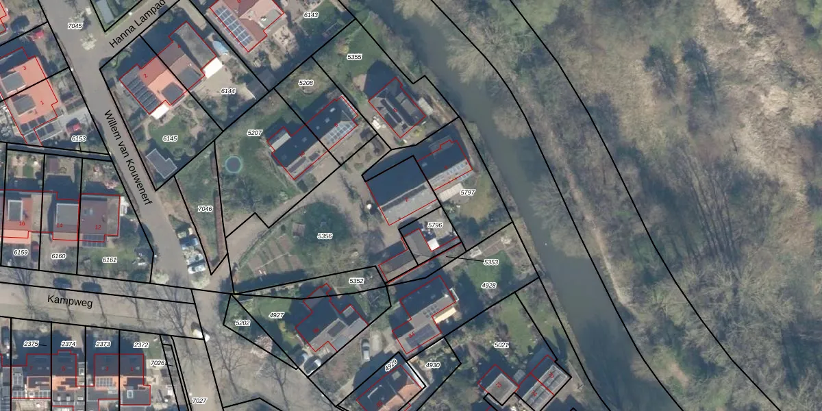 Het perceel waarop Kampweg 2 staat heeft een oppervlakte van 1040 m². Dit is een zeer groot perceel. De perceeloppervlakte wordt geregistreerd door het Kadaster. Gedetailleerde informatie over de maten van dit perceel kunt u vinden in het rapport Kadastrale kaart met maatvoering van Kampweg 2.