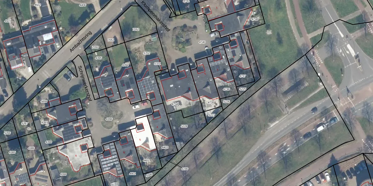 Het perceel waarop Klompenmakershof 6 staat heeft een oppervlakte van 458 m². Dit is een groot perceel. De perceeloppervlakte wordt geregistreerd door het Kadaster. Gedetailleerde informatie over de maten van dit perceel kunt u vinden in het rapport Kadastrale kaart met maatvoering van Klompenmakershof 6.