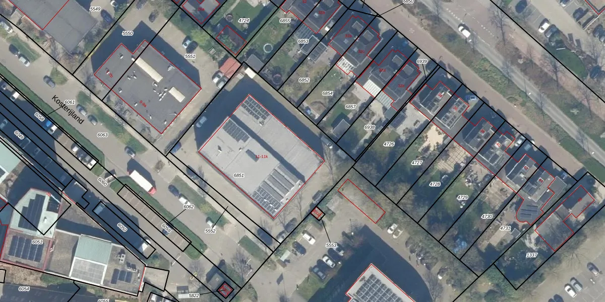 Het perceel waarop Kosterijland 11-k staat heeft een oppervlakte van 1850 m². Dit is een zeer groot perceel. De perceeloppervlakte wordt geregistreerd door het Kadaster. Gedetailleerde informatie over de maten van dit perceel kunt u vinden in het rapport Kadastrale kaart met maatvoering van Kosterijland 11-k.