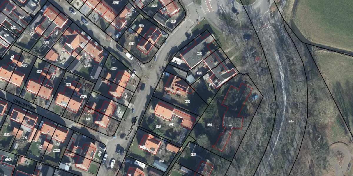 Gebruik de zoekbalk of klik op een perceel voor informatie over de adressen binnen dit perceel.