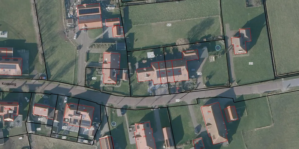 Het perceel waarop Kooiweg 21 staat heeft een oppervlakte van 787 m². Dit is een groot perceel. De perceeloppervlakte wordt geregistreerd door het Kadaster. Gedetailleerde informatie over de maten van dit perceel kunt u vinden in het rapport Kadastrale kaart met maatvoering van Kooiweg 21.