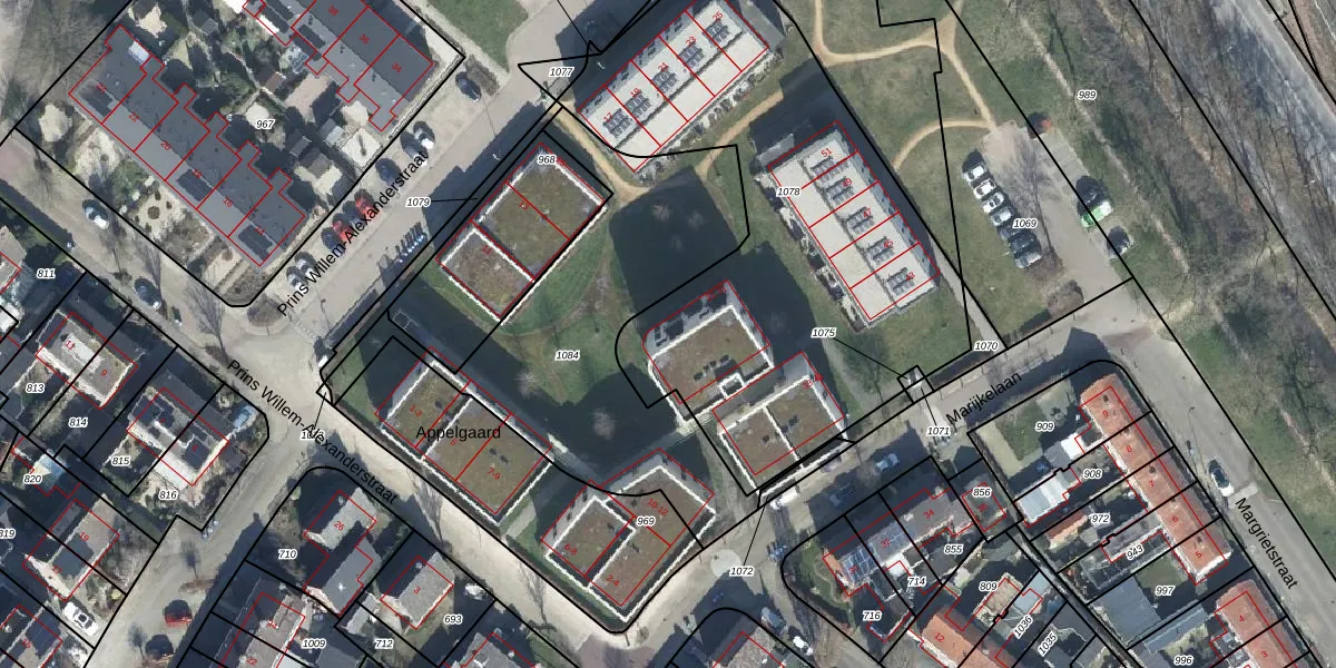 Het perceel waarop Marijkelaan 29 staat heeft een oppervlakte van 2464 m². Dit is een zeer groot perceel. De perceeloppervlakte wordt geregistreerd door het Kadaster. Gedetailleerde informatie over de maten van dit perceel kunt u vinden in het rapport Kadastrale kaart met maatvoering van Marijkelaan 29.