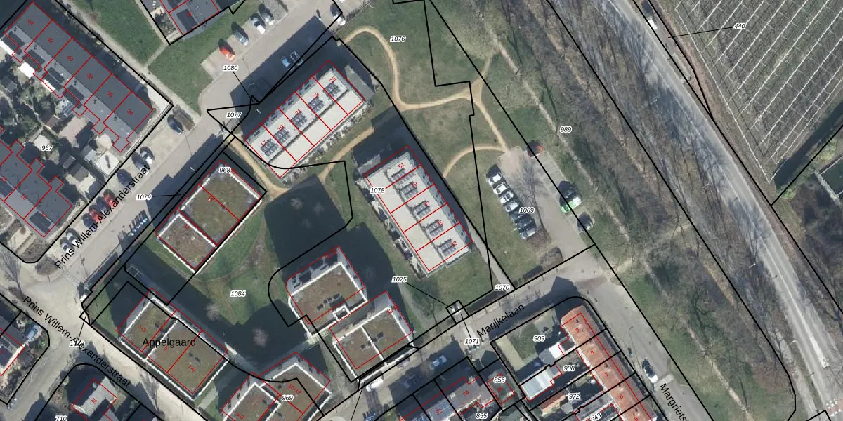 Het perceel waarop Marijkelaan 47 staat heeft een oppervlakte van 2464 m². Dit is een zeer groot perceel. De perceeloppervlakte wordt geregistreerd door het Kadaster. Gedetailleerde informatie over de maten van dit perceel kunt u vinden in het rapport Kadastrale kaart met maatvoering van Marijkelaan 47.
