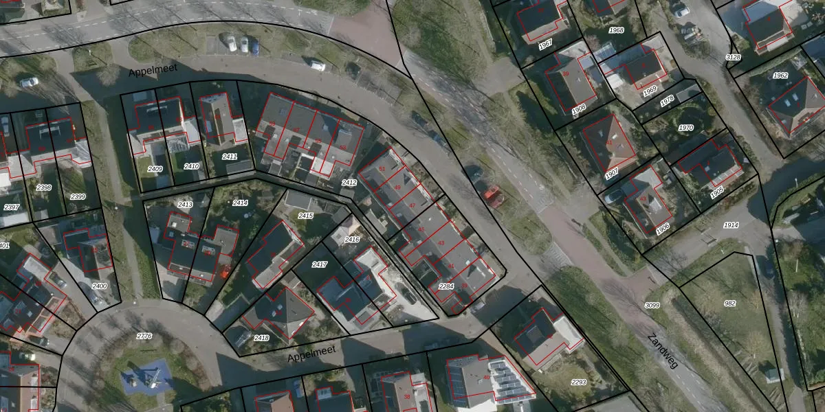 Het perceel waarop Appelmeet 47 staat heeft een oppervlakte van 970 m². Dit is een groot perceel. De perceeloppervlakte wordt geregistreerd door het Kadaster. Gedetailleerde informatie over de maten van dit perceel kunt u vinden in het rapport Kadastrale kaart met maatvoering van Appelmeet 47.