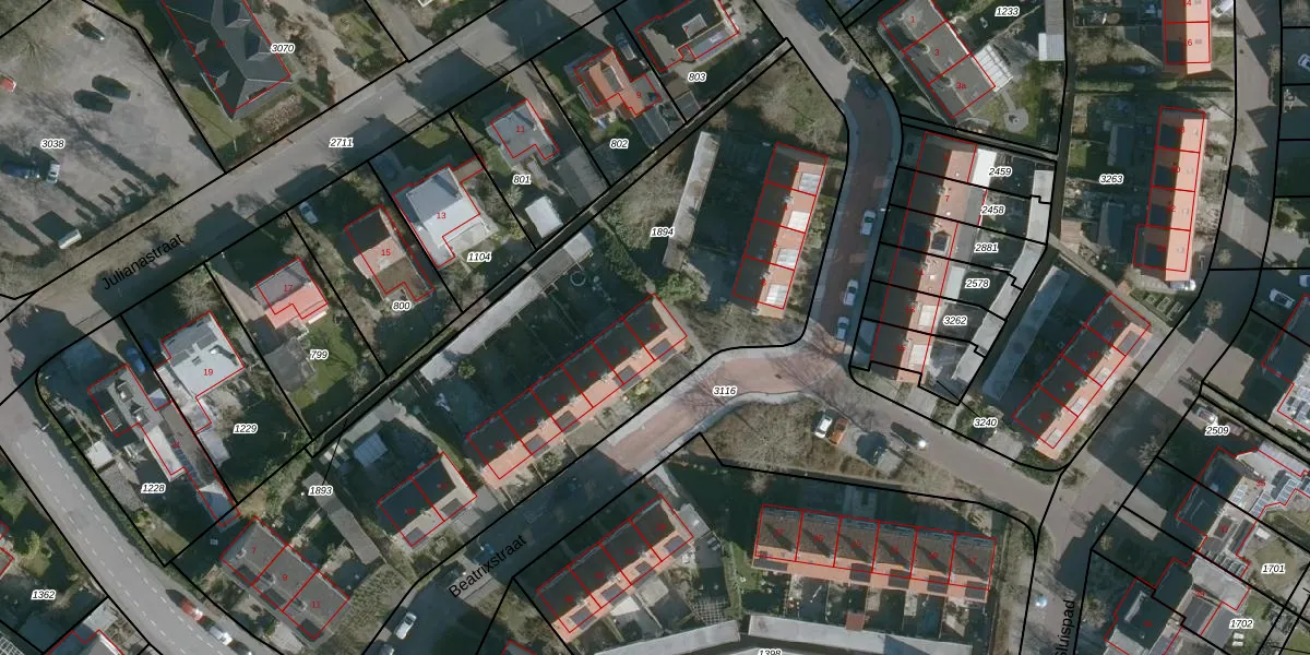 Het perceel waarop Beatrixstraat 10 staat heeft een oppervlakte van 3255 m². Dit is een zeer groot perceel. De perceeloppervlakte wordt geregistreerd door het Kadaster. Gedetailleerde informatie over de maten van dit perceel kunt u vinden in het rapport Kadastrale kaart met maatvoering van Beatrixstraat 10.