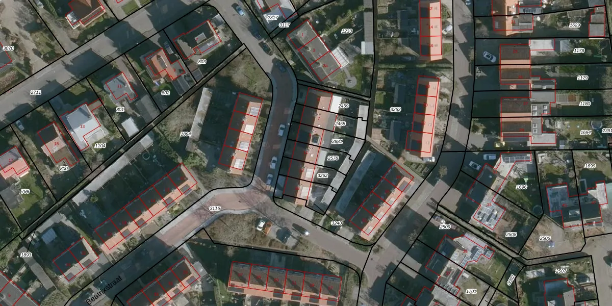 Gebruik de zoekbalk of klik op een perceel voor informatie over de adressen binnen dit perceel.