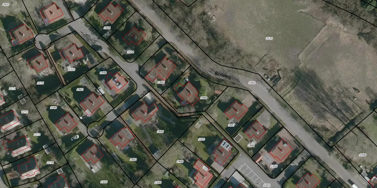 Het perceel waarop Bosweg 15 staat heeft een oppervlakte van 491 m². Dit is een groot perceel. De perceeloppervlakte wordt geregistreerd door het Kadaster. Gedetailleerde informatie over de maten van dit perceel kunt u vinden in het rapport Kadastrale kaart met maatvoering van Bosweg 15.