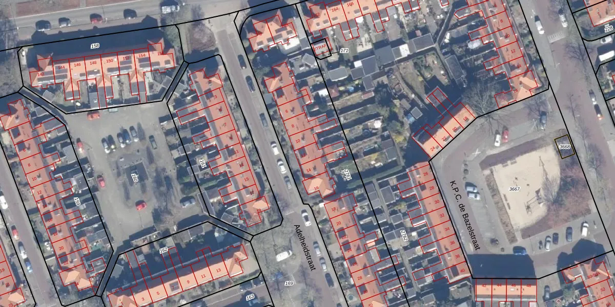 Het perceel waarop Adelheidstraat 12 staat heeft een oppervlakte van 3393 m². Dit is een zeer groot perceel. De perceeloppervlakte wordt geregistreerd door het Kadaster. Gedetailleerde informatie over de maten van dit perceel kunt u vinden in het rapport Kadastrale kaart met maatvoering van Adelheidstraat 12.
