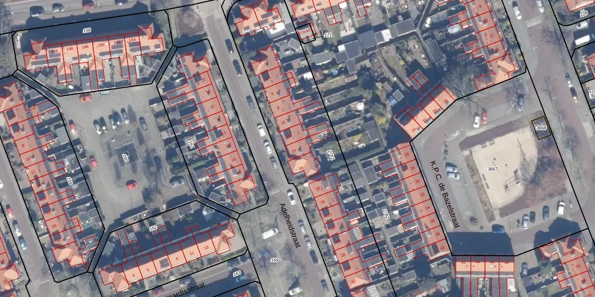 Het perceel waarop Adelheidstraat 14 staat heeft een oppervlakte van 3393 m². Dit is een zeer groot perceel. De perceeloppervlakte wordt geregistreerd door het Kadaster. Gedetailleerde informatie over de maten van dit perceel kunt u vinden in het rapport Kadastrale kaart met maatvoering van Adelheidstraat 14.