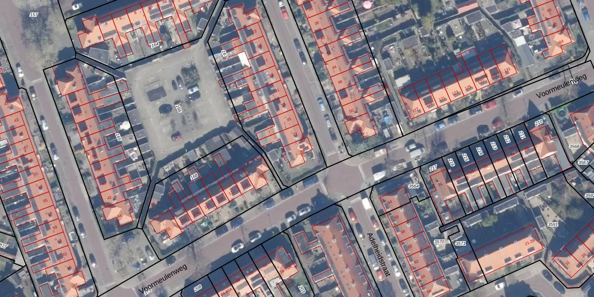 Het perceel waarop Adelheidstraat 39 staat heeft een oppervlakte van 1260 m². Dit is een zeer groot perceel. De perceeloppervlakte wordt geregistreerd door het Kadaster. Gedetailleerde informatie over de maten van dit perceel kunt u vinden in het rapport Kadastrale kaart met maatvoering van Adelheidstraat 39.