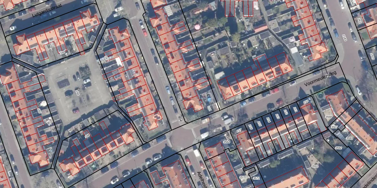 Het perceel waarop Adelheidstraat 50 staat heeft een oppervlakte van 3393 m². Dit is een zeer groot perceel. De perceeloppervlakte wordt geregistreerd door het Kadaster. Gedetailleerde informatie over de maten van dit perceel kunt u vinden in het rapport Kadastrale kaart met maatvoering van Adelheidstraat 50.