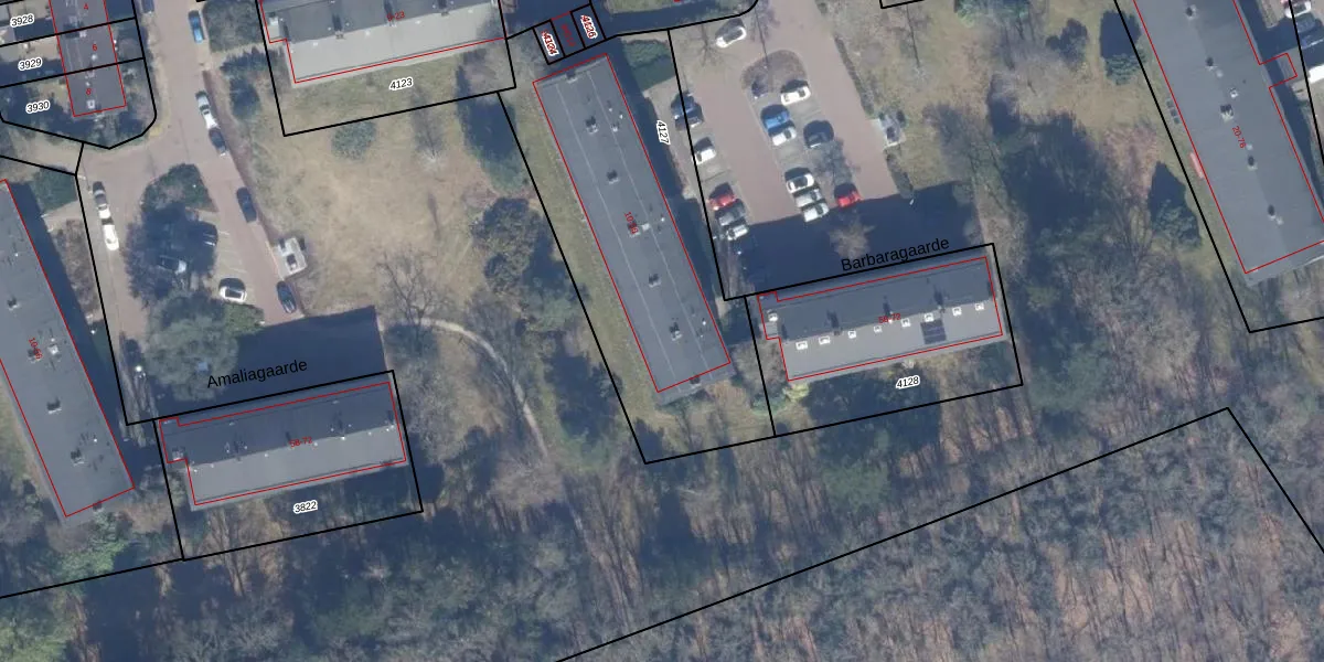 Het perceel waarop Barbaragaarde 56 staat heeft een oppervlakte van 1476 m². Dit is een zeer groot perceel. De perceeloppervlakte wordt geregistreerd door het Kadaster. Gedetailleerde informatie over de maten van dit perceel kunt u vinden in het rapport Kadastrale kaart met maatvoering van Barbaragaarde 56.