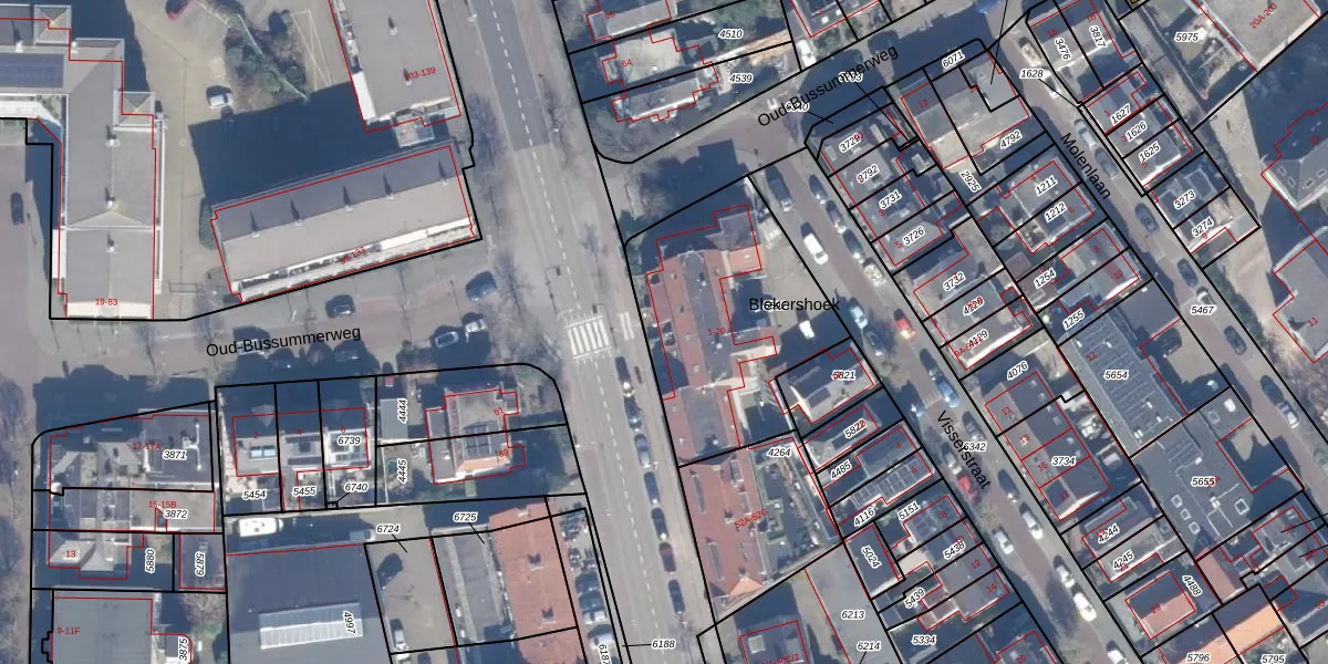 Blekershoek 16 is gelegen op kadastraal perceel BSM01B5892. Deze kadastrale aanduiding is uniek en wordt gebruikt door het Kadaster om eigendomsrechten en andere zakelijke rechten vast te leggen. Het perceel maakt onderdeel uit van de kadastrale gemeente Bussum.