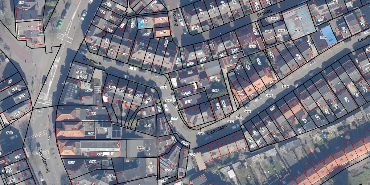Het perceel waarop Cereslaan 38 staat heeft een oppervlakte van 87 m². Dit is een klein perceel. De perceeloppervlakte wordt geregistreerd door het Kadaster. Gedetailleerde informatie over de maten van dit perceel kunt u vinden in het rapport Kadastrale kaart met maatvoering van Cereslaan 38.
