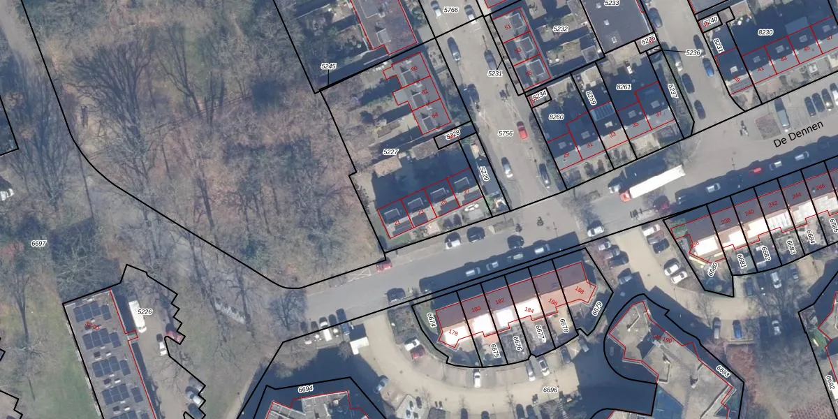 Het perceel waarop De Dennen 23 staat heeft een oppervlakte van 1215 m². Dit is een zeer groot perceel. De perceeloppervlakte wordt geregistreerd door het Kadaster. Gedetailleerde informatie over de maten van dit perceel kunt u vinden in het rapport Kadastrale kaart met maatvoering van De Dennen 23.