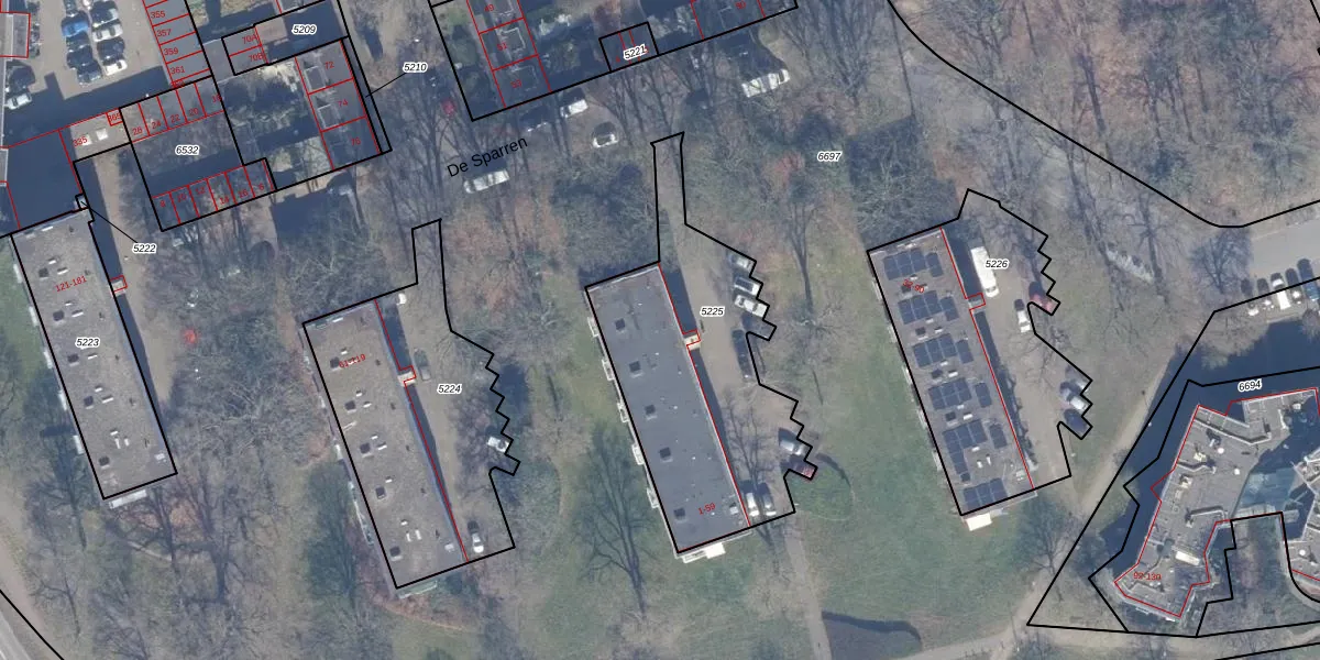 De Sparren 5 is gelegen op kadastraal perceel BSM01D5225. Deze kadastrale aanduiding is uniek en wordt gebruikt door het Kadaster om eigendomsrechten en andere zakelijke rechten vast te leggen. Het perceel maakt onderdeel uit van de kadastrale gemeente Bussum.