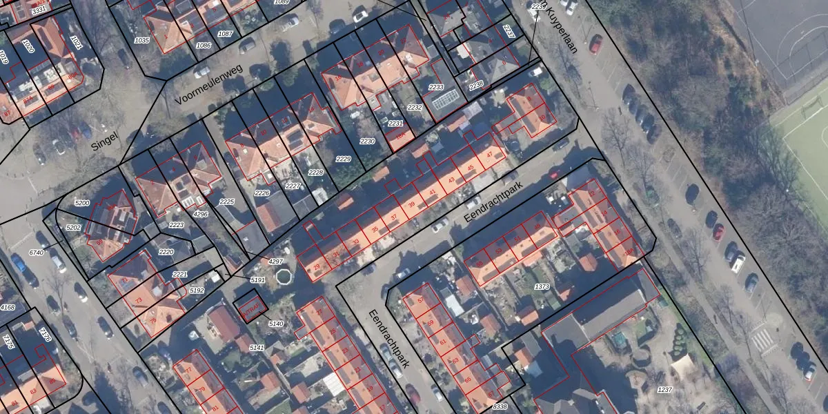 Het perceel waarop Eendrachtpark 39 staat heeft een oppervlakte van 4853 m². Dit is een zeer groot perceel. De perceeloppervlakte wordt geregistreerd door het Kadaster. Gedetailleerde informatie over de maten van dit perceel kunt u vinden in het rapport Kadastrale kaart met maatvoering van Eendrachtpark 39.
