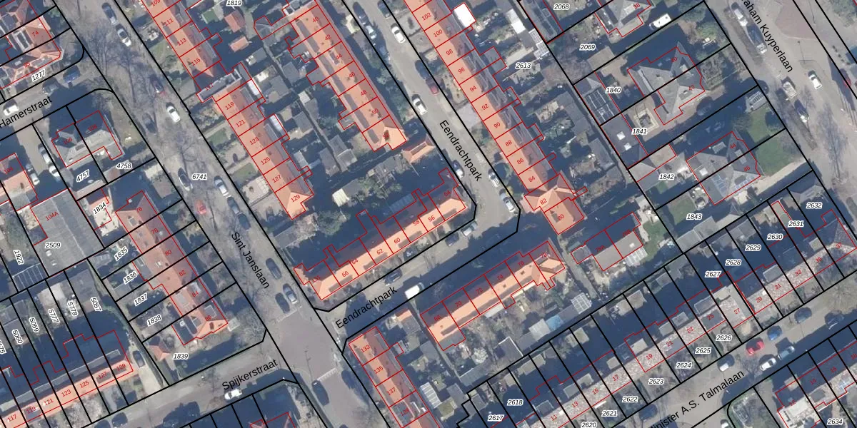 Het perceel waarop Eendrachtpark 56 staat heeft een oppervlakte van 6720 m². Dit is een zeer groot perceel. De perceeloppervlakte wordt geregistreerd door het Kadaster. Gedetailleerde informatie over de maten van dit perceel kunt u vinden in het rapport Kadastrale kaart met maatvoering van Eendrachtpark 56.