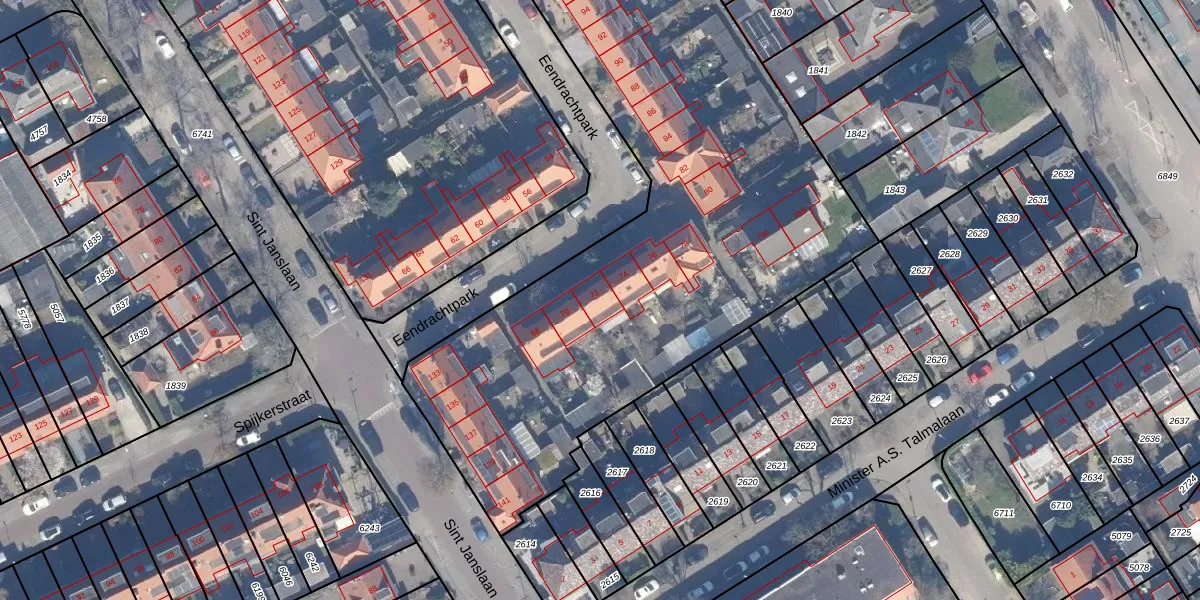 Het perceel waarop Eendrachtpark 72 staat heeft een oppervlakte van 5404 m². Dit is een zeer groot perceel. De perceeloppervlakte wordt geregistreerd door het Kadaster. Gedetailleerde informatie over de maten van dit perceel kunt u vinden in het rapport Kadastrale kaart met maatvoering van Eendrachtpark 72.