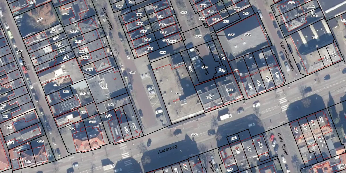 Huizerweg 19-A is gelegen op kadastraal perceel BSM01B5182. Deze kadastrale aanduiding is uniek en wordt gebruikt door het Kadaster om eigendomsrechten en andere zakelijke rechten vast te leggen. Het perceel maakt onderdeel uit van de kadastrale gemeente Bussum.