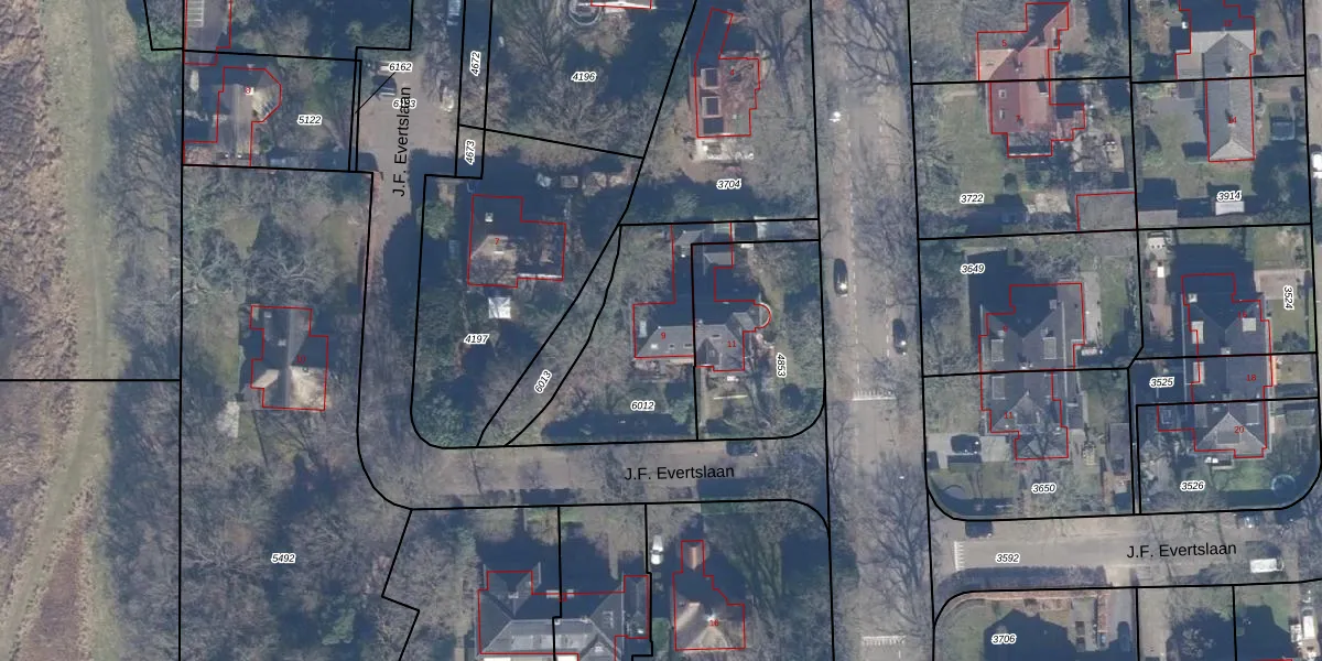 Het perceel waarop J.F. Evertslaan 9 staat heeft een oppervlakte van 645 m². Dit is een groot perceel. De perceeloppervlakte wordt geregistreerd door het Kadaster. Gedetailleerde informatie over de maten van dit perceel kunt u vinden in het rapport Kadastrale kaart met maatvoering van J.F. Evertslaan 9.