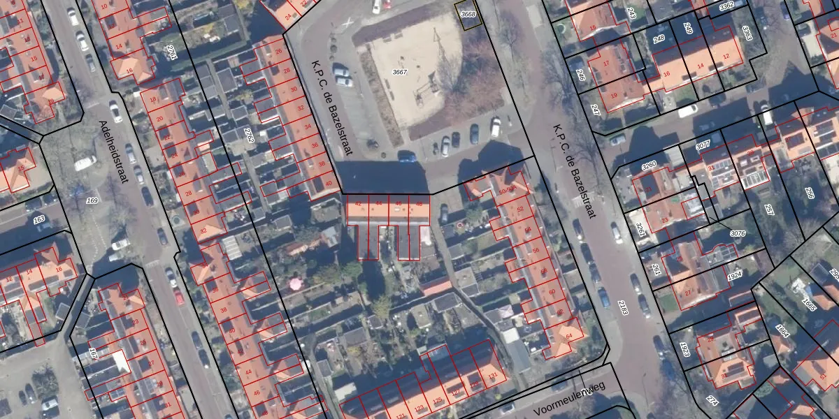 Het perceel waarop K.P.C. de Bazelstraat 48 staat heeft een oppervlakte van 8598 m². Dit is een zeer groot perceel. De perceeloppervlakte wordt geregistreerd door het Kadaster. Gedetailleerde informatie over de maten van dit perceel kunt u vinden in het rapport Kadastrale kaart met maatvoering van K.P.C. de Bazelstraat 48.