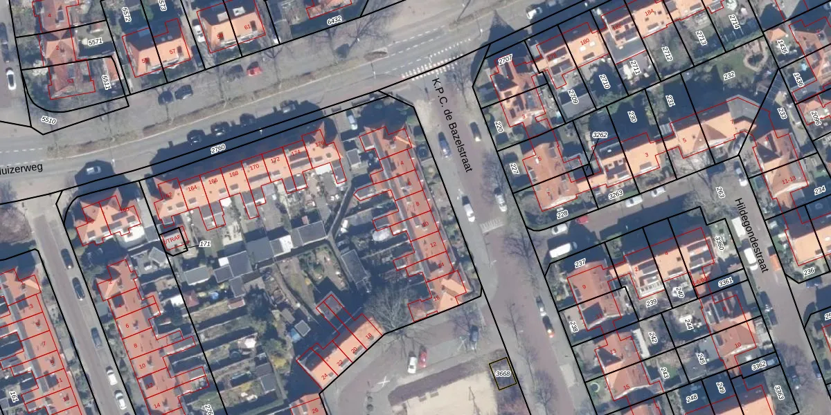 Het perceel waarop K.P.C. de Bazelstraat 8 staat heeft een oppervlakte van 8598 m². Dit is een zeer groot perceel. De perceeloppervlakte wordt geregistreerd door het Kadaster. Gedetailleerde informatie over de maten van dit perceel kunt u vinden in het rapport Kadastrale kaart met maatvoering van K.P.C. de Bazelstraat 8.