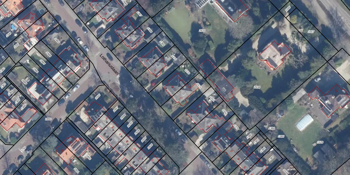 Het perceel waarop Lothariuslaan 69 staat heeft een oppervlakte van 313 m². Dit is een groot perceel. De perceeloppervlakte wordt geregistreerd door het Kadaster. Gedetailleerde informatie over de maten van dit perceel kunt u vinden in het rapport Kadastrale kaart met maatvoering van Lothariuslaan 69.
