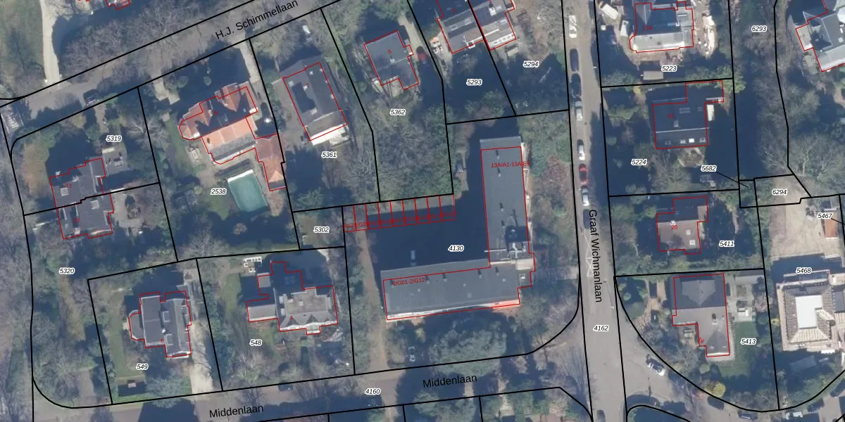 Het perceel waarop Middenlaan 2-G15 staat heeft een oppervlakte van 2602 m². Dit is een zeer groot perceel. De perceeloppervlakte wordt geregistreerd door het Kadaster. Gedetailleerde informatie over de maten van dit perceel kunt u vinden in het rapport Kadastrale kaart met maatvoering van Middenlaan 2-G15.