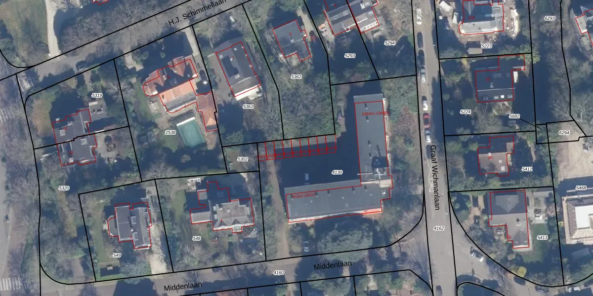 Het perceel waarop Middenlaan 2-G17 staat heeft een oppervlakte van 2602 m². Dit is een zeer groot perceel. De perceeloppervlakte wordt geregistreerd door het Kadaster. Gedetailleerde informatie over de maten van dit perceel kunt u vinden in het rapport Kadastrale kaart met maatvoering van Middenlaan 2-G17.