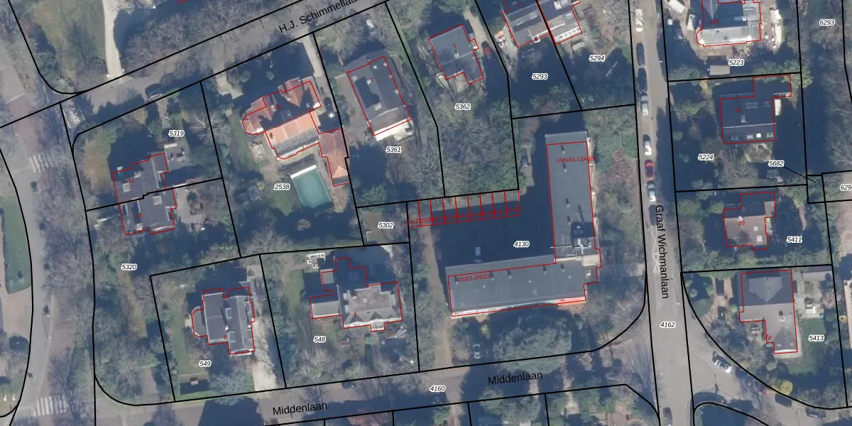 Het perceel waarop Middenlaan 2-G20 staat heeft een oppervlakte van 2602 m². Dit is een zeer groot perceel. De perceeloppervlakte wordt geregistreerd door het Kadaster. Gedetailleerde informatie over de maten van dit perceel kunt u vinden in het rapport Kadastrale kaart met maatvoering van Middenlaan 2-G20.