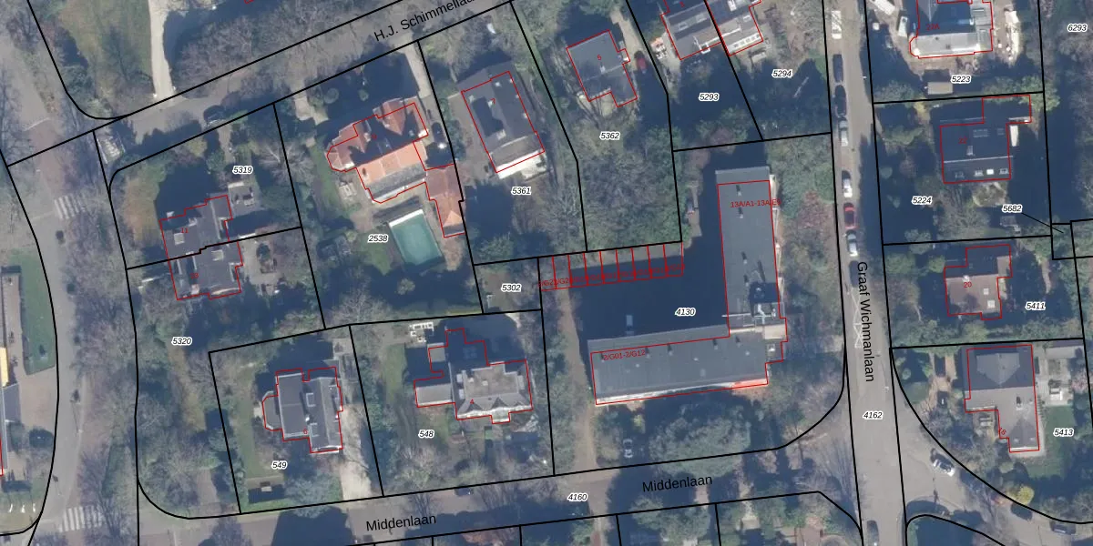 Het perceel waarop Middenlaan 2-G21 staat heeft een oppervlakte van 2602 m². Dit is een zeer groot perceel. De perceeloppervlakte wordt geregistreerd door het Kadaster. Gedetailleerde informatie over de maten van dit perceel kunt u vinden in het rapport Kadastrale kaart met maatvoering van Middenlaan 2-G21.