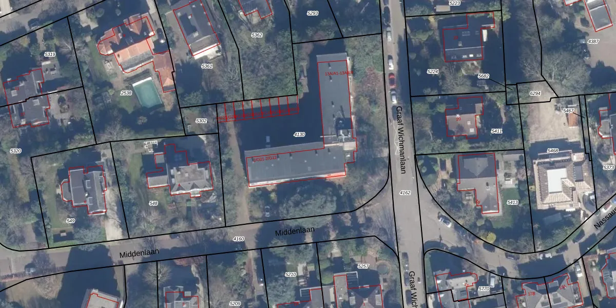 Het perceel waarop Middenlaan 2-G05 staat heeft een oppervlakte van 2602 m². Dit is een zeer groot perceel. De perceeloppervlakte wordt geregistreerd door het Kadaster. Gedetailleerde informatie over de maten van dit perceel kunt u vinden in het rapport Kadastrale kaart met maatvoering van Middenlaan 2-G05.