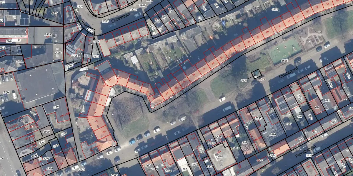 Het perceel waarop Oosterpad 25 staat heeft een oppervlakte van 8532 m². Dit is een zeer groot perceel. De perceeloppervlakte wordt geregistreerd door het Kadaster. Gedetailleerde informatie over de maten van dit perceel kunt u vinden in het rapport Kadastrale kaart met maatvoering van Oosterpad 25.