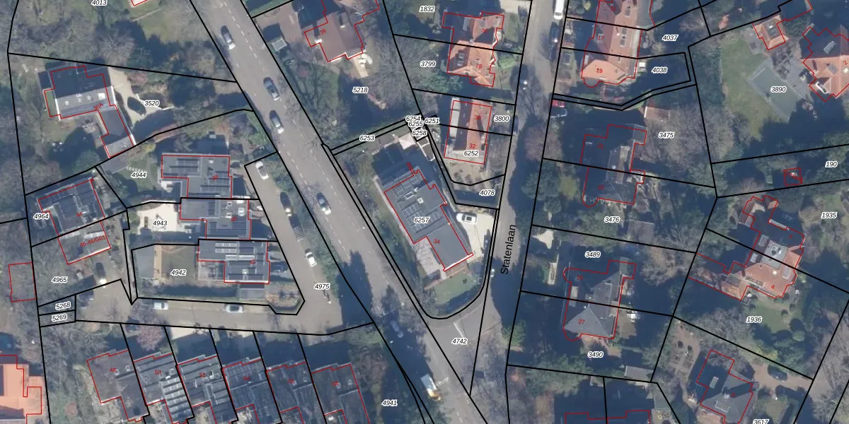 Statenlaan 34 is gelegen op kadastraal perceel BSM01E6257. Deze kadastrale aanduiding is uniek en wordt gebruikt door het Kadaster om eigendomsrechten en andere zakelijke rechten vast te leggen. Het perceel maakt onderdeel uit van de kadastrale gemeente Bussum.