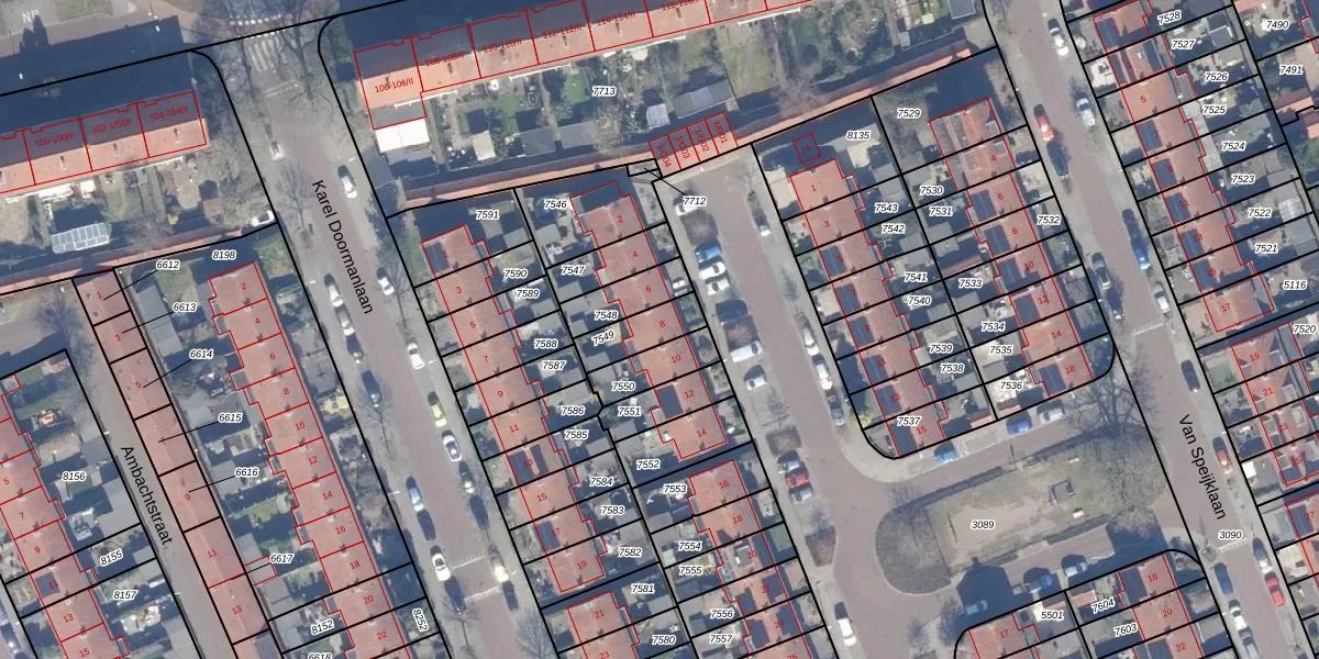 Gebruik de zoekbalk of klik op een perceel voor informatie over de adressen binnen dit perceel.