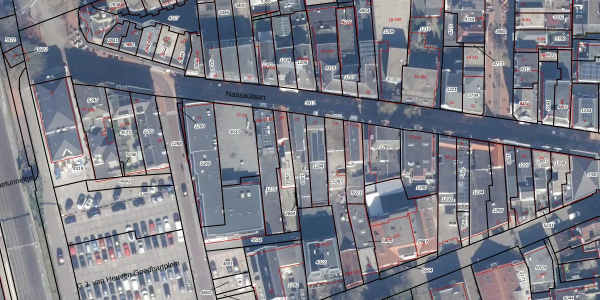 Het adres is gelegen op perceel 1283 in de sectie E en de kadastrale gemeente Bussum. De kadastrale aanduiding is aldus BSM01-E-1283. Het perceel is 165 m² groot. Dat is kleiner dan de gemiddelde perceeloppervlakte in Bussum, dat op 593,97 m² ligt. Het grootste perceel in de kadastrale gemeente is 38,9 ha. Het kleinste perceel heeft een oppervlakte van 0 m². Op het perceel liggen in totaal 3 adressen. In de Basisregistratie Kadaster (BRK) werden de grenzen van het perceel geregistreerd op 03-12-1999.